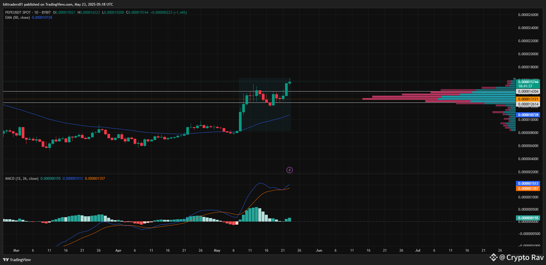 Pepe has recently broken through the ceiling of its medium- to long-term downward trend, signaling a potential shift in market sentiment and a deceleration in its prior decline. The currency is now testing a key resistance level at 17.00 points, where a rejection could lead to a short-term pullback. However, a confirmed breakout above this level would be a strong bullish signal, indicating further upside potential. Volume activity supports this momentum, as the positive volume balance suggests strong investor interest during price increases and limited selling pressure during downturns. Additionally, the RSI has climbed above 70, reflecting robust recent gains and strong upward momentum. While this supports the bullish outlook, the elevated RSI also raises caution, as it may indicate overbought conditions—particularly in larger, more liquid assets—opening the door for a possible short-term correction. Overall, the outlook remains optimistic, but investors should watch closely for a decisive move at the 17.00-point mark. Point of control is at 0.0000132