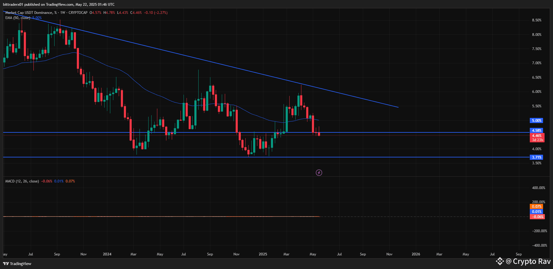 USDT Dominance (USDT.D) is showing signs of weakness and may fall toward the 3.71% level—a move that carries a strong bullish implication for the broader crypto market. A decline in USDT.D indicates that capital is rotating out of stable coins and flowing back into risk-on assets like Bitcoin, Ethereum, and altcoins. This shift in sentiment suggests growing confidence among traders and investors, often preceding upward momentum in the market. For long traders, this is a promising signal—money is moving from the sidelines back into action, potentially fueling the next leg up. Keep an eye on USDT.D as it approaches key support, as continued downside could align with bullish price action across major crypto assets.