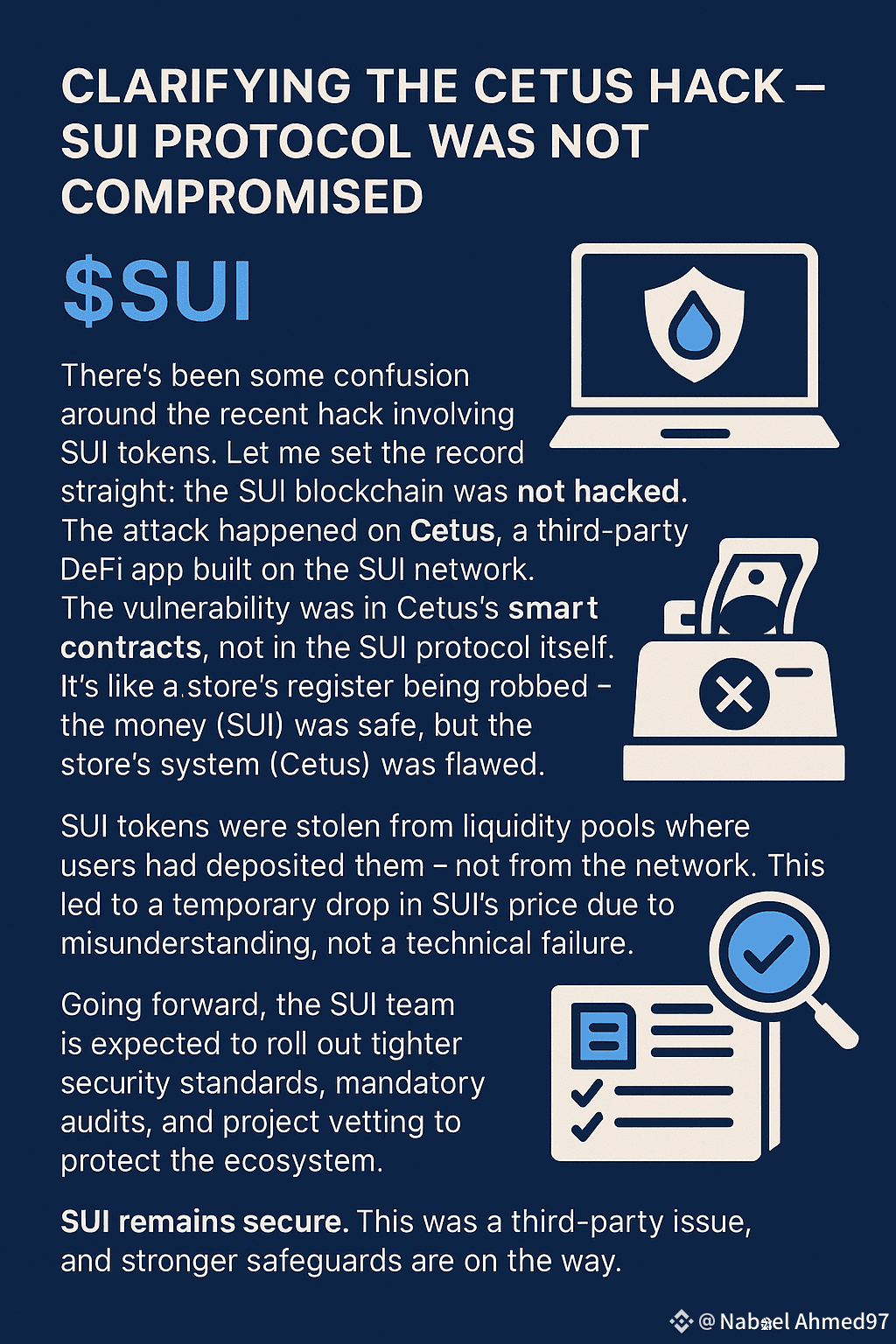 The vulnerability was in Cetus’s smart contracts, not in the $SUI protocol itself. It’s like a store’s register being robbed—the money (SUI) was safe, but the store’s system (Cetus) was flawed.
