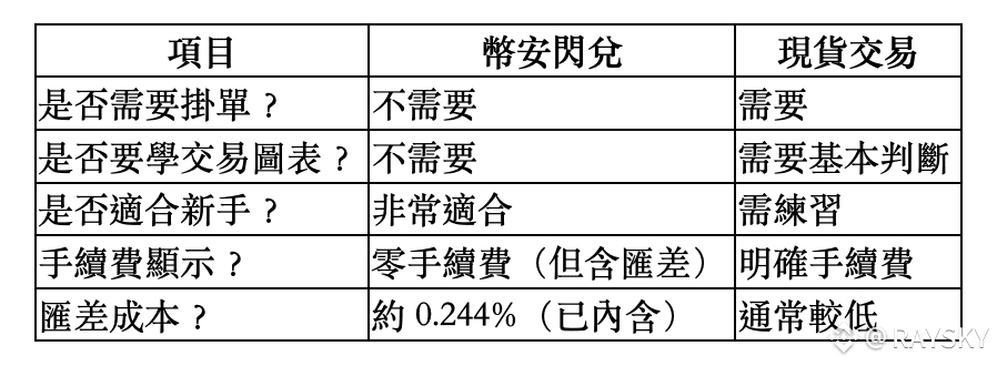 表格比較|幣安閃兌 vs 傳統現貨交易