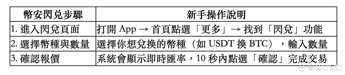 幣安閃兌,是幣安交易所提供的「快速兌換加密貨幣」工具,專為新手設計。