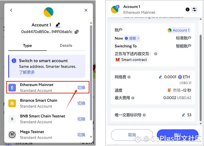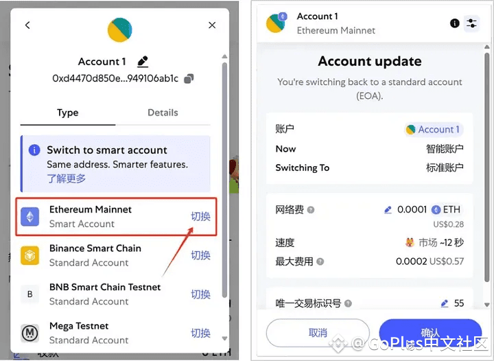 升级流程:进入钱包的账户详情界面,点击下图中的切换按钮,即可将用户在Ethereum Mainnet升级为智能账户。点击切换之后,出现用户签名当前升级交易窗口: