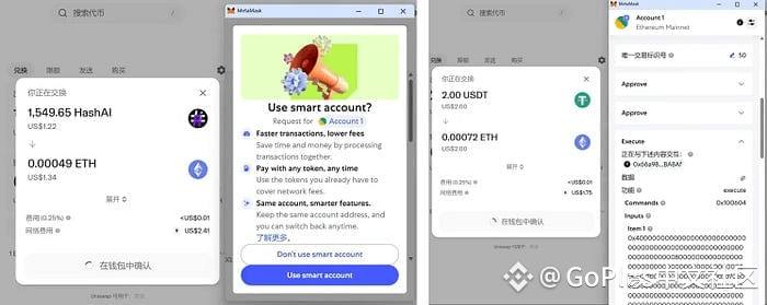 升级流程:在用户与链上某些DApp交互时,Metamask会主动提示用户当前交易可以通过升级成智能账户使用批量发送的方式来完成.例如在Uniswap上进行某些token的swap,点击Use smart account 按钮,升级成智能账户,之后代币授权和Swap将在一笔交易中批量完成。