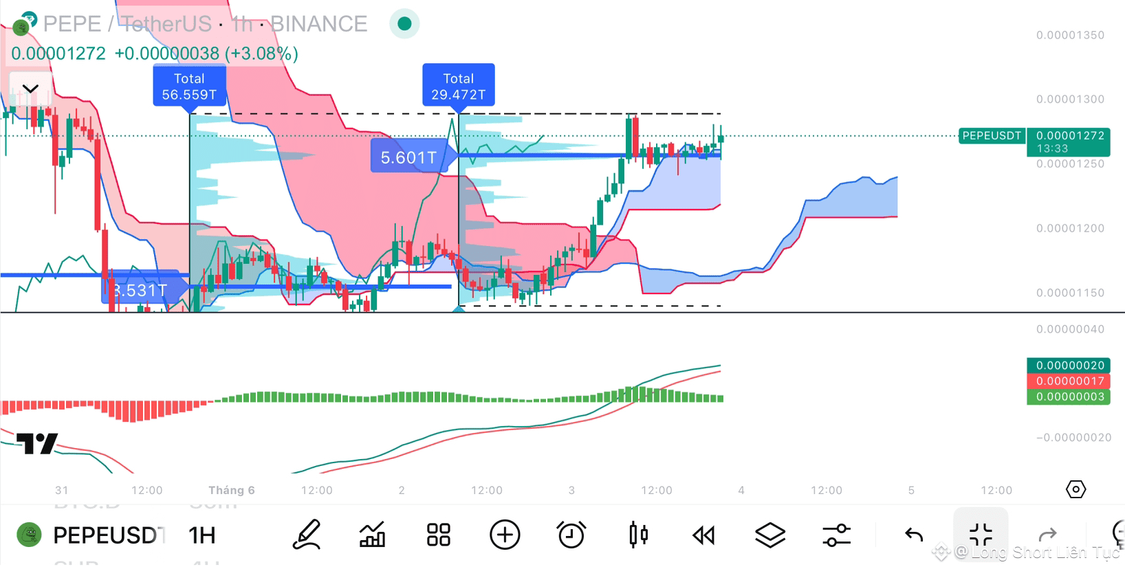 Sau nhiều ngày đi ngang trong vùng tích lũy 0.01150 – 0.01260, 1000PEPEUSDT đã chính thức breakout khỏi kháng cự với volume lớn. Mây Ichimoku chuyển xanh hoàn toàn, MACD cắt lên và duy trì trên 0 cho thấy xung lực tăng vẫn còn mạnh. Vùng 0.01260 giờ trở thành hỗ trợ ngắn hạn, là điểm vào lệnh lý tưởng nếu có pullback. Volume tích lũy trước breakout đạt hơn 56T, trong khi breakout đi kèm 29T dòng tiền xác nhận. Đây là tín hiệu rõ ràng cho thấy smart money đã nhập cuộc. Mục tiêu giá hướng đến vùng đỉnh cũ quanh 0.01330 – 0.01350. Chiến lược là mua khi giá hồi về vùng breakout, cắt lỗ nhẹ dưới đáy gần nhất.