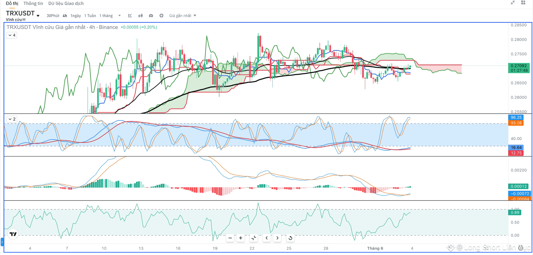 • Histogram co lại => cảnh báo sắp có biến động mạnh, khả năng dump nếu không giữ giá được trên 0.275.