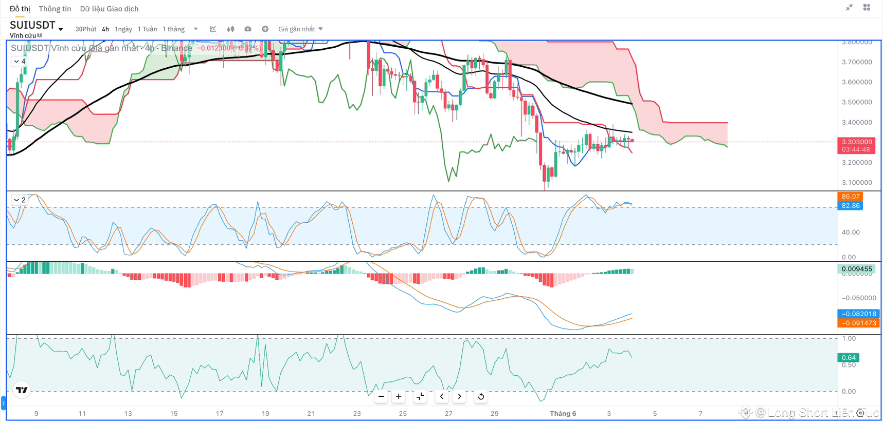 • Giá SUI đang hồi lên trong xu hướng giảm lớn, gặp ngay vùng mây và EMA chặn đầu.