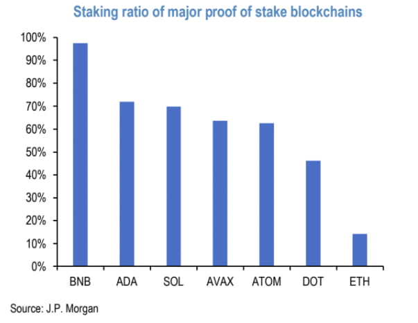 Compared to other Major PoS networks such as Avalanche (AVAX), BNB, Polkadot, and Solana. Ethereum has a relatively low staking ratio of only 14%, so after the upgrade, there's room for the staking ratio to increase to the average of the networks, which is ~60%