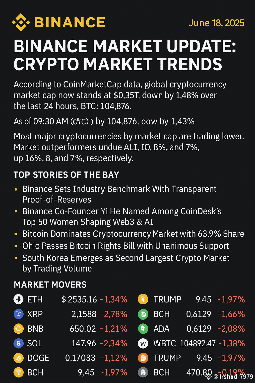 🔻 BTC trades at $104,876, down 1.43%, ranging between $103,371 and $106,441.