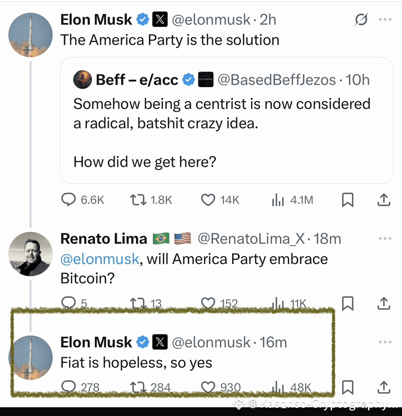 In a bold X Platform, Elon Musk just dropped a statement thatâs sending shockwaves through the crypto community. When asked if the America Party would embrace Bitcoin, Musk responded with a blunt and powerful declaration: âFiat is hopeless, so yes.â