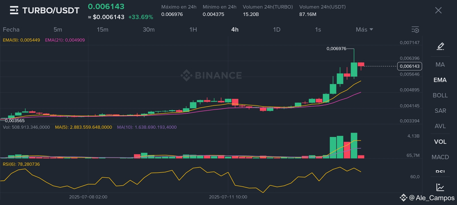 TURBO es un token altamente especulativo (meme coin). Disciplina y stops claros son clave para evitar pérdidas fuertes ante cambios bruscos. Mantén siempre liquidez disponible para ajustar posiciones si el mercado da confirmaciones.