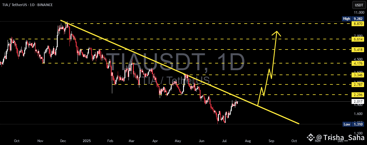 If TIA successfully breaks and closes above the $2.30 – $2.78 range with strong volume, it could trigger a major mid-term rally. The potential upside targets are aligned with previous structural resistance levels: