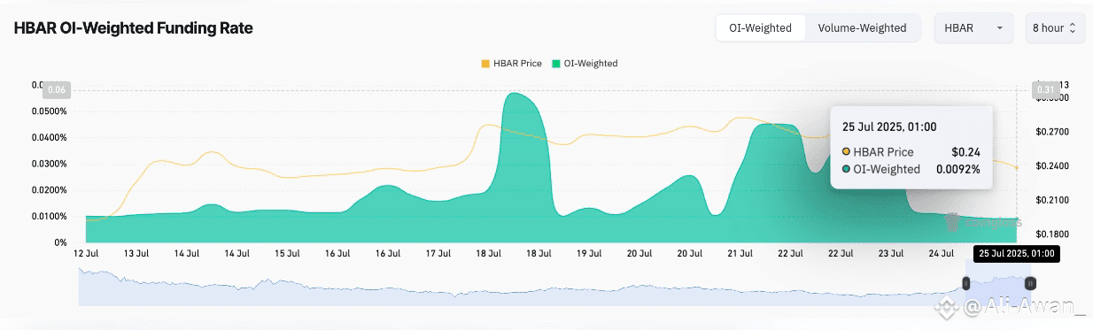 HBAR’s consistently positive funding rate, even during its recent dip, signals lingering bullish sentiment among traders. It hints at potential upward momentum once market conditions stabilize.
