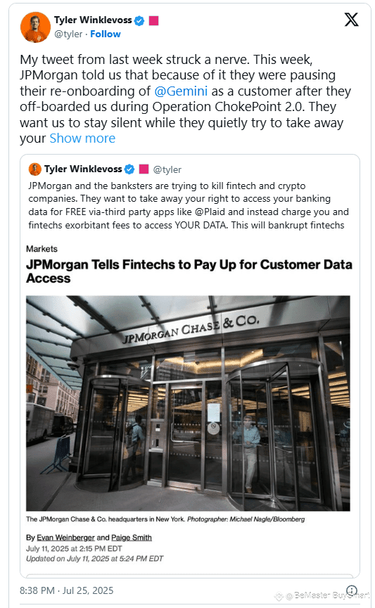 Winklevoss also accused JPMorgan of trying to limit consumers’ ability to share their own financial data with third-party fintech services like Plaid.