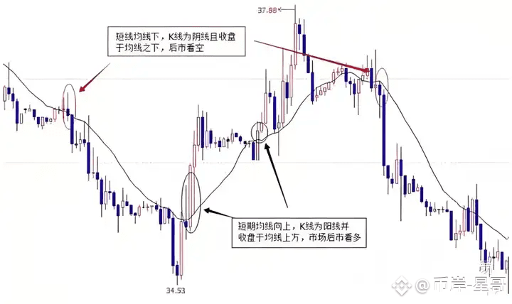 当短期均线向下,K线收盘时为阴线,收盘价在短期均线下方,市场后市看空。
