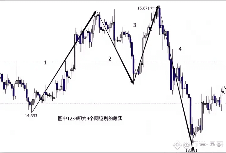 段落是结构的最基本组成部分,由多根K线组成一个段落,这些K线最高点(最低点)至最低点(最高点)的连线即成一个段落。