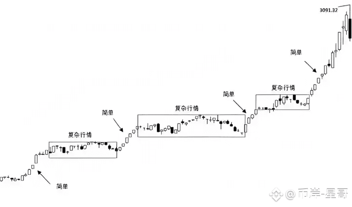 简单与复杂体现的是K线的运动模式交替过程。我们通过简单复杂交替控制交易节奏。