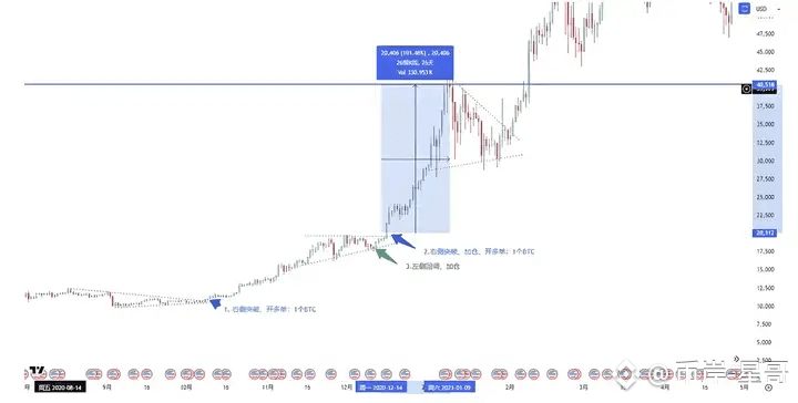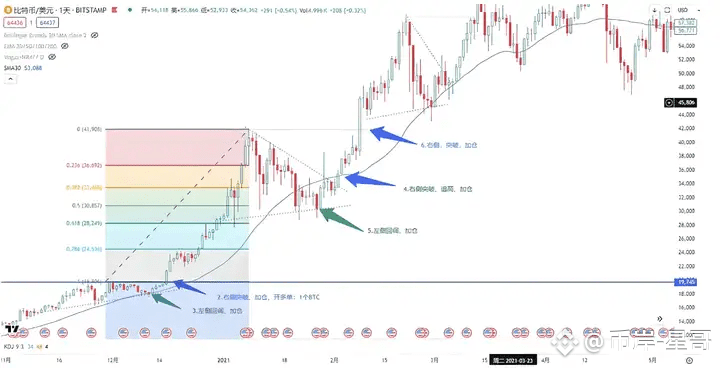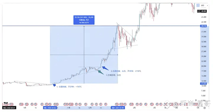 比特币2020-2021牛市复盘。从2020年10月到2021年3月,比特币从1万美元涨至6万美元。我们以这段行情为例,复盘滚仓操作如何助力资金快速增长