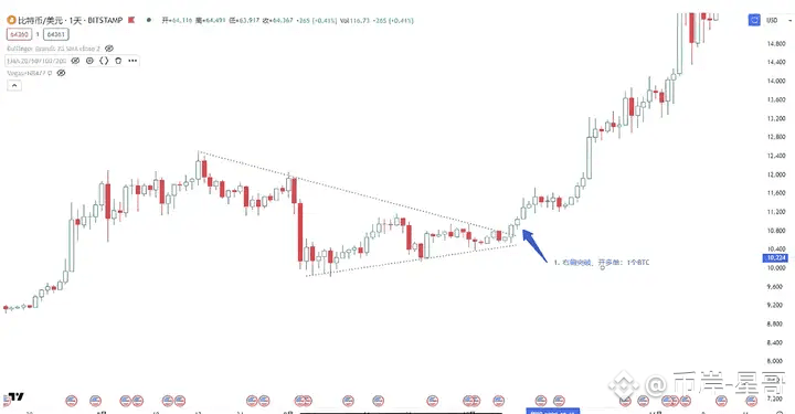 来到下图箭头所在位置的K线,我们可以看到,经过一段中长期的震荡,比特币走出了一个收敛三角形的结构。在这个位置,一根大阳线向上突破了上方的下降趋势线,给我们发出了一个多头信号。