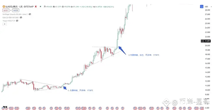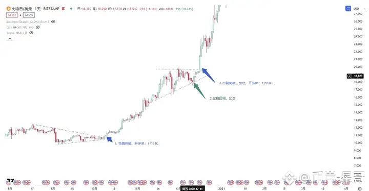 (图三)在这个位置,正是肥宅定义中的恰当时机,也就是滚仓的时机,位于箭头2所指的地方。如果我们在这个位置进行右侧追突破,开了一个BTC的多单,可以看到比特币在几次中长期震荡后,通过一根大阳线突破了前高。这个位置符合肥宅交易的三板斧:右侧交易、追突破、浮盈加仓。