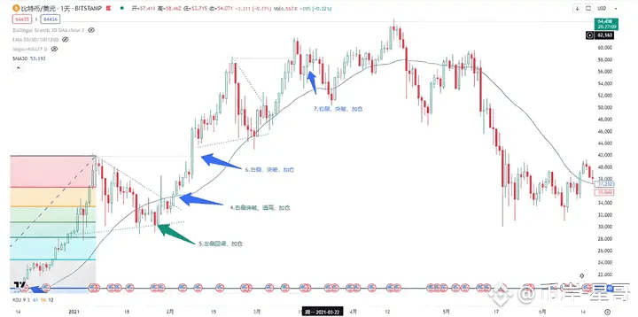 我们从40518这个价格往后续看,会发现后面也出现了滚仓的机会。如下图点位4是一个右侧追突破的位置,适合进行滚仓。同样地,点位5是一个左侧回调加仓的位置(和前面点位3类似,左侧加仓有更好的盈亏比)