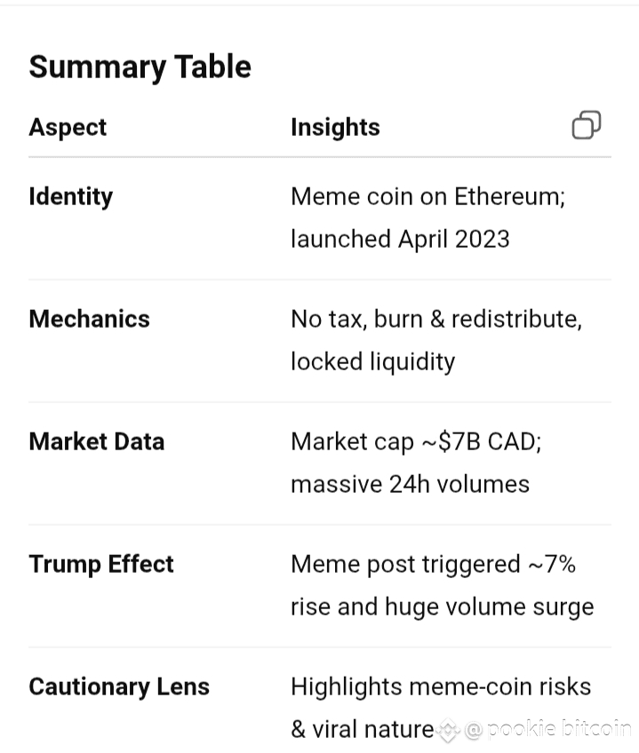 A Truth Social post by Trump featuring a Pepe meme (“on a mission from God”) sparked a 7% price jump and a dramatic spike in daily trading volume to around $1.6 billion