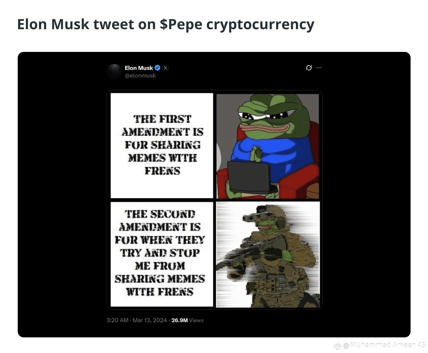 On March 13, 2024, Musk posted a meme featuring Pepe the Frog. Shortly afterward, the price of the Pepe cryptocurrency jumped by 12.2%, breaking the $0.000009 mark. While this timing drew attention, it’s important to note that correlation doesn’t imply causation. The price movement may have been influenced by broader memecoin activity, technical setups or other social factors, not just the meme post itself.
