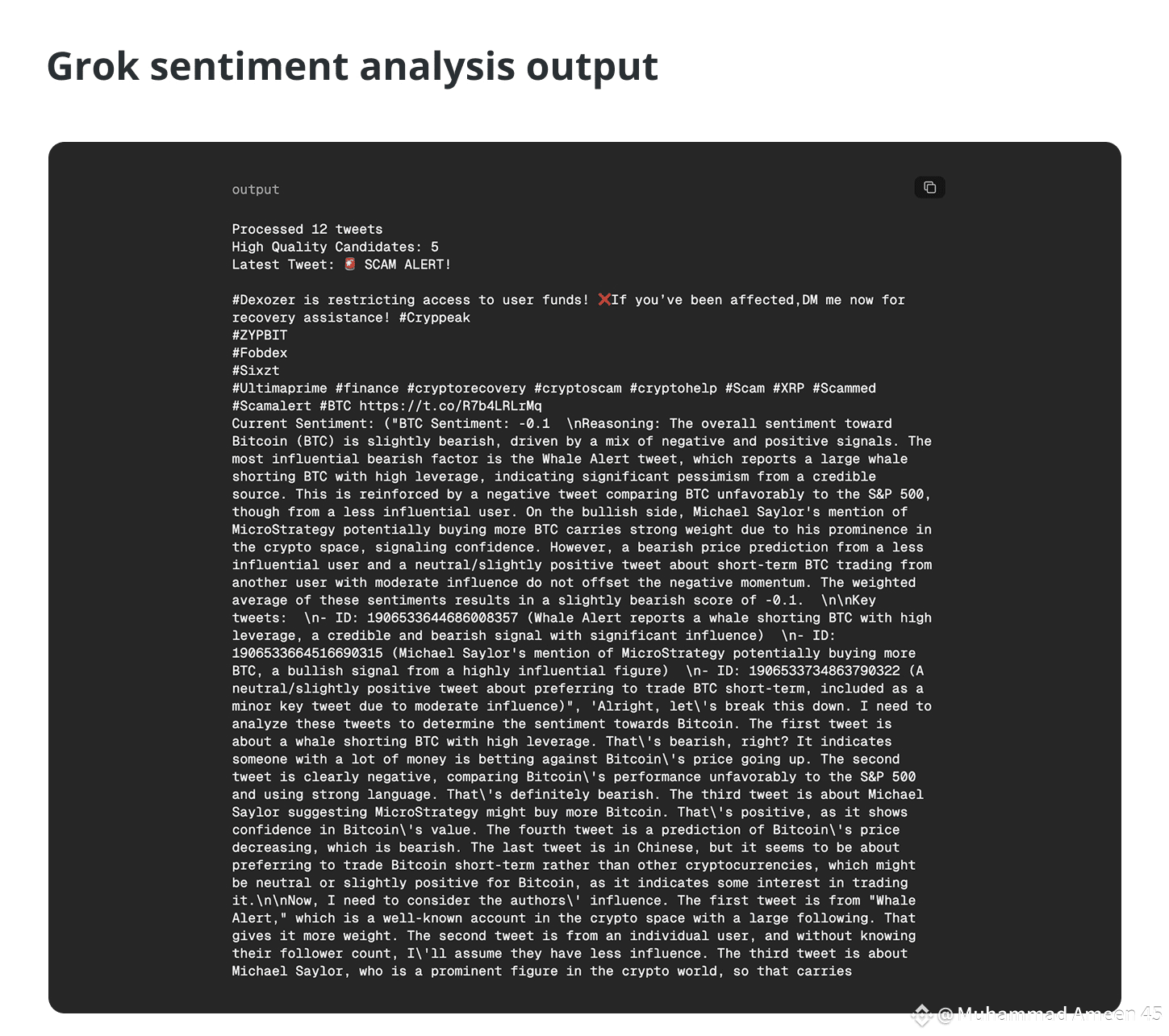 Below is an example output from a custom sentiment parser built using Grok’s access to X, analyzing 12 posts about Bitcoin (BTC) in a six-hour window. The data set included posts from high-profile accounts like Whale Alert and Michael Saylor, as well as smaller influencers commenting on BTC leverage, short-term trading and macro comparisons. The goal was to measure the emotional and directional tone of real-time crypto sentiment during a volatile trading session.