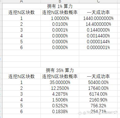 我简单算了一下。这只是自然概率,按照门罗一天 1440 个区块,35% 算力数学期望每天就可以攻击成功 2.6 次。这还没算自私挖矿的加成,算上就更高,否则 Qubic 未必舍得花钱短时间内租算力冲击 6 块。