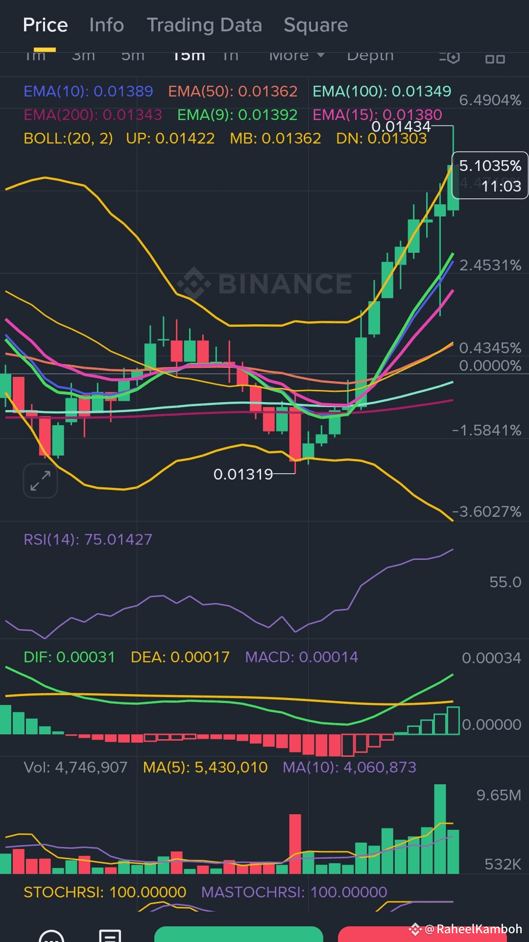 · StochRSI = 74.79 (Overbought Territory) — Momentum is strong. No divergence here either.