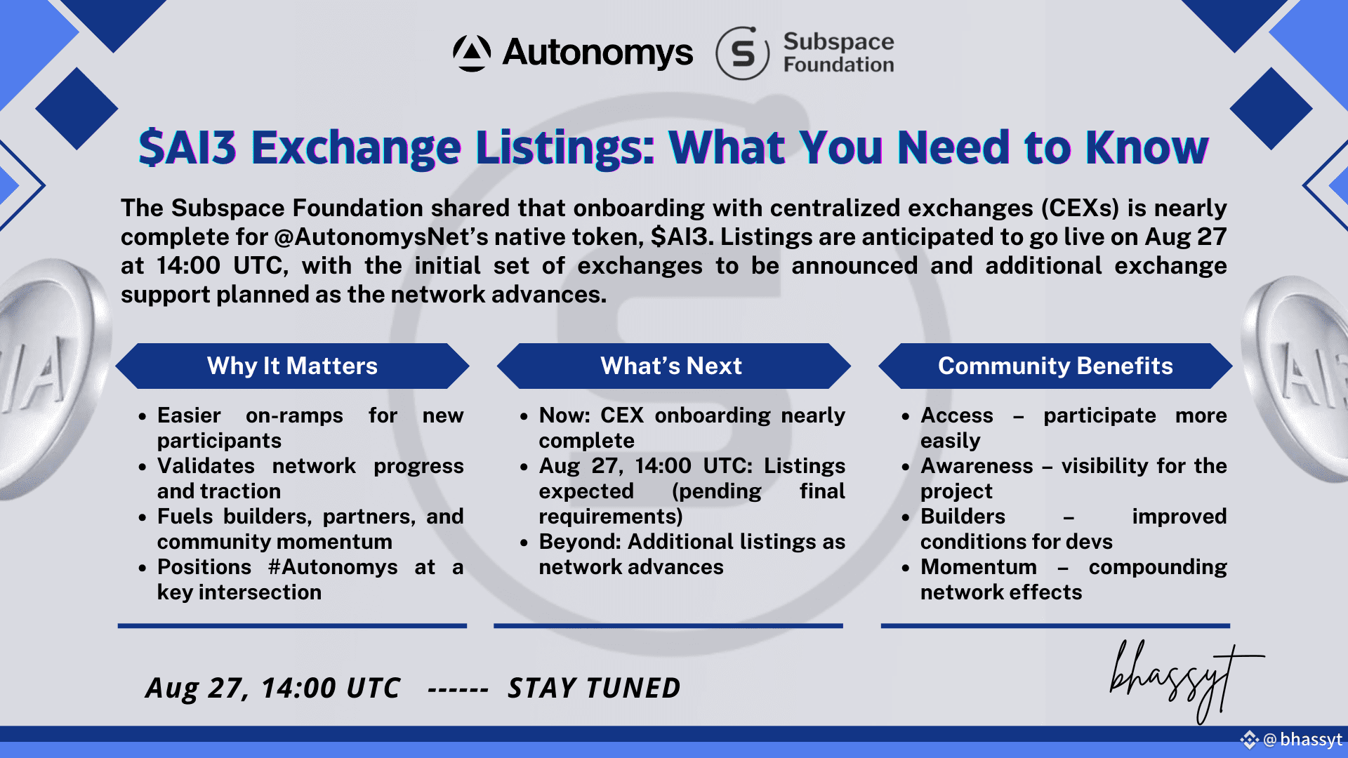 The wait is almost over! On August 27th at 14:00 UTC, Autonomys native token $AI3 is set to debut on major centralized exchanges (CEXs). This marks a pivotal moment not only for Autonomys but for the broader Web3 and AI communities.