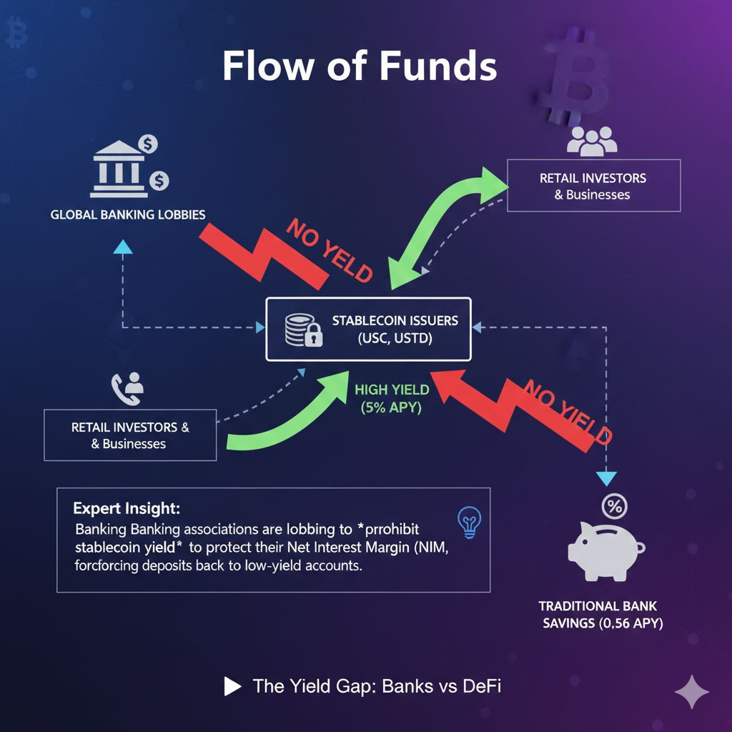 The Banking Logic: If a user can get 5% yield on a "safe" stablecoin while a bank savings account offers 0.5%, the bank loses its deposits (liquidity).