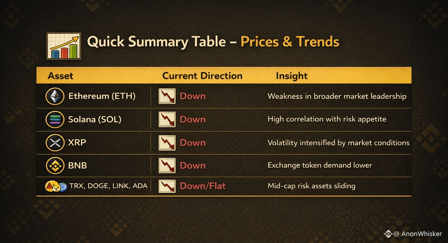 Most top altcoins are showing negative price performance today Ethereum, SOL, XRP, BNB and others are all down. This indicates traders are reducing exposure in risk assets and reacting to broader macro or crypto‑specific pressures.