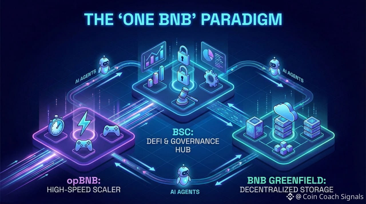 BNB Chain in 2026 is no longer just a copy of Ethereum. It is a divergent, high-performance beast. It has solved the "Trilemma" by modularizing its architecture: BSC for security and DeFi, opBNB for speed and gaming, and Greenfield for data ownership.
