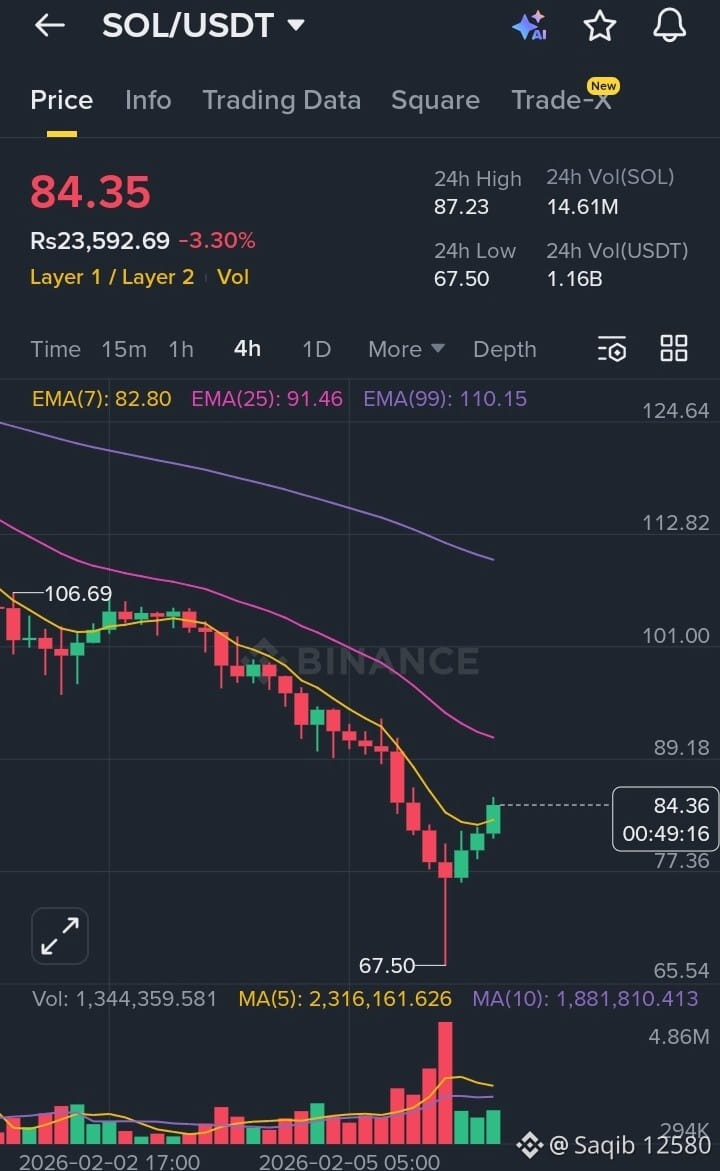 #solona is trading near the $84 zone after a strong bearish move from the $100+ area. On the 4H timeframe, price is still below major EMAs, showing that the overall trend remains bearish, but a short-term pullback from the $67.50 support is visible.