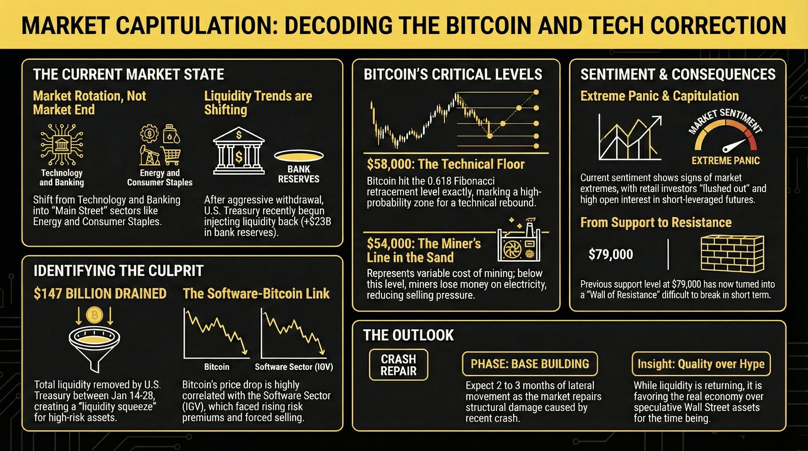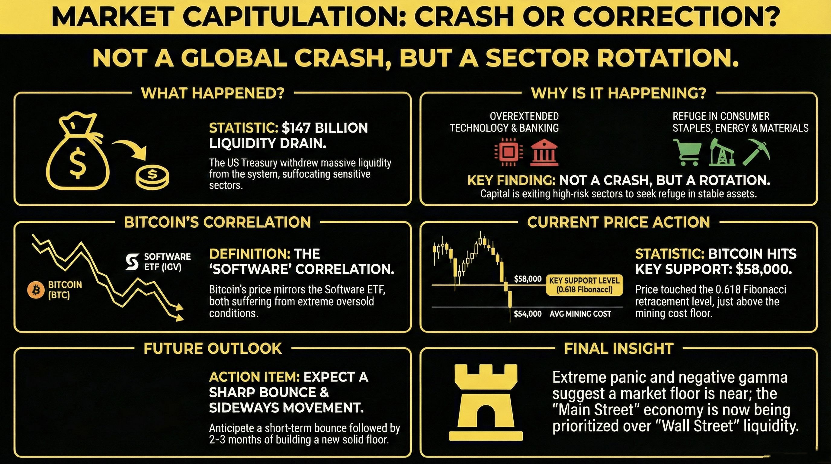 To the undisciplined observer, the recent volatility in digital assets and equities signals a terminal market top. However, a structural diagnostic reveals a more nuanced reality: we are navigating a period of mechanical deleveraging and a sophisticated rotation of capital rather than a secular trend reversal. The strategic imperative is to distinguish between a cyclical correction and a structural shift. Currently, we are witnessing a massive migration of funds away from overextended sectors—specifically Technology and Banking—and toward defensive, "real-world" verticals such as Consumer Staples, Energy, and Basic Materials.