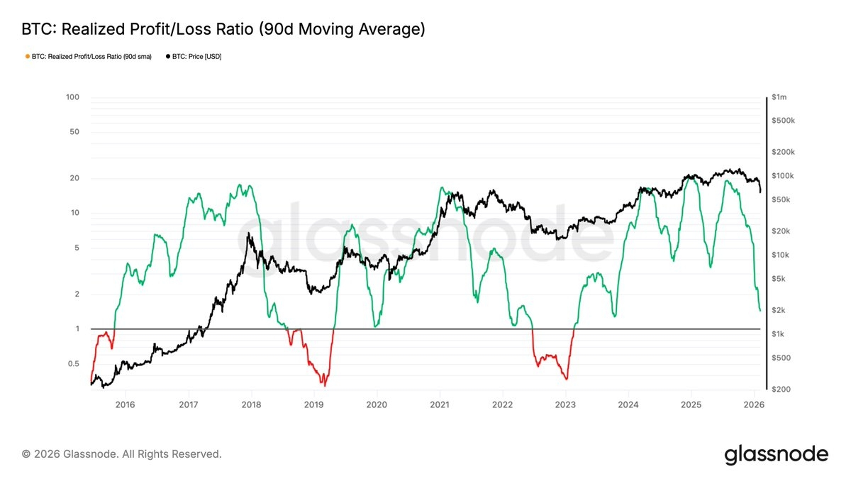 尽管在2025年 10 月初出现了第二个 ATH,但实现盈亏比(90D-SMA)自2025年 7 月底以来一直在下降。现在数据已经降到了~1.45,标志着市场盈利能力的急剧恶化,尽管仍高于历史上极端投降时的<1 水平,如果后面真的<1了,果断加大仓位抄底即可。