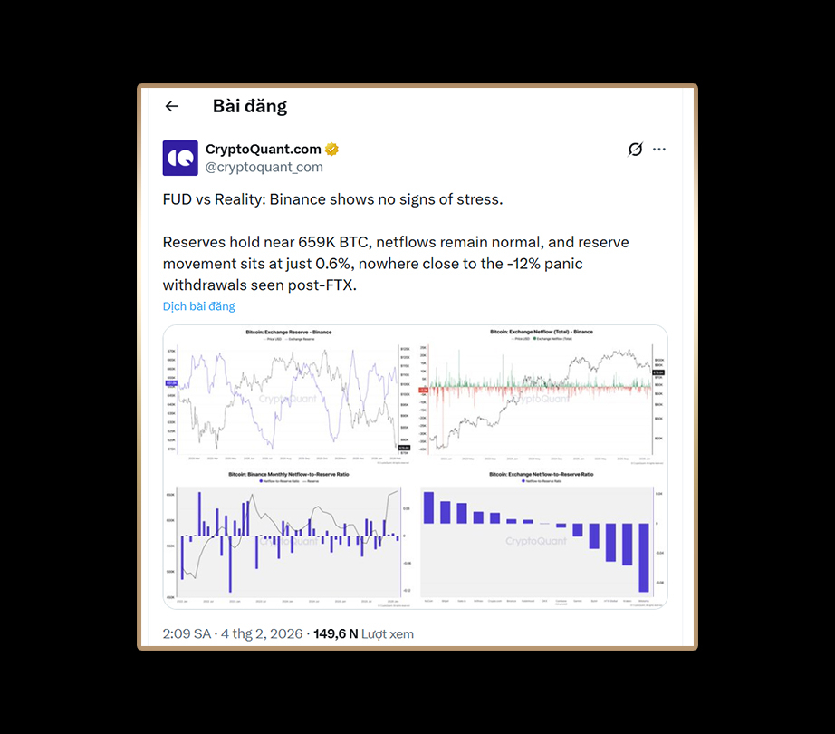 🔸Duy trì minh bạch số dư dự trữ: Theo CryptoQuant, số dư Bitcoin của Binance vẫn ổn định ở mức ~659,000 BTC, không có dấu hiệu căng thẳng tài chính.