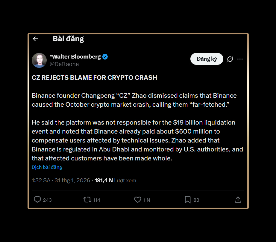 CZ đã trực tiếp phản hồi 4 tin FUD chính trên X vào ngày 3/2/2026: