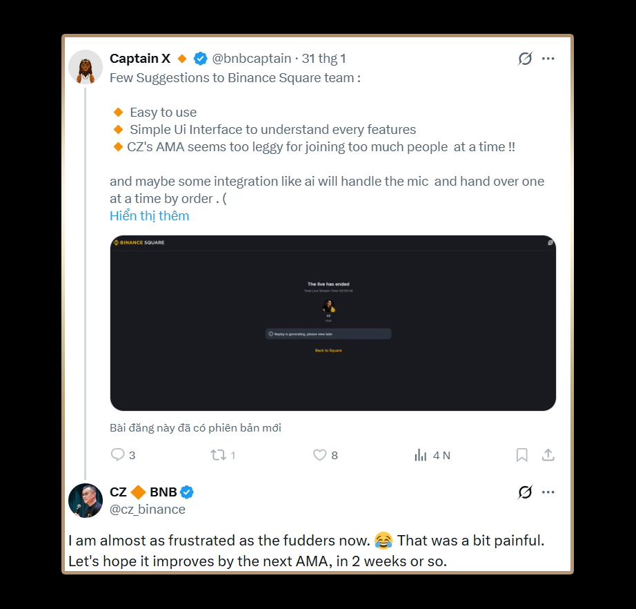 🔸Về AMA trực tiếp: CZ thừa nhận có lỗi kỹ thuật nhưng cam kết cải thiện "Tôi cũng thất vọng gần như những người tung tin FUD bây giờ. Hy vọng lần AMA tiếp theo trong 2 tuần nữa sẽ tốt hơn"