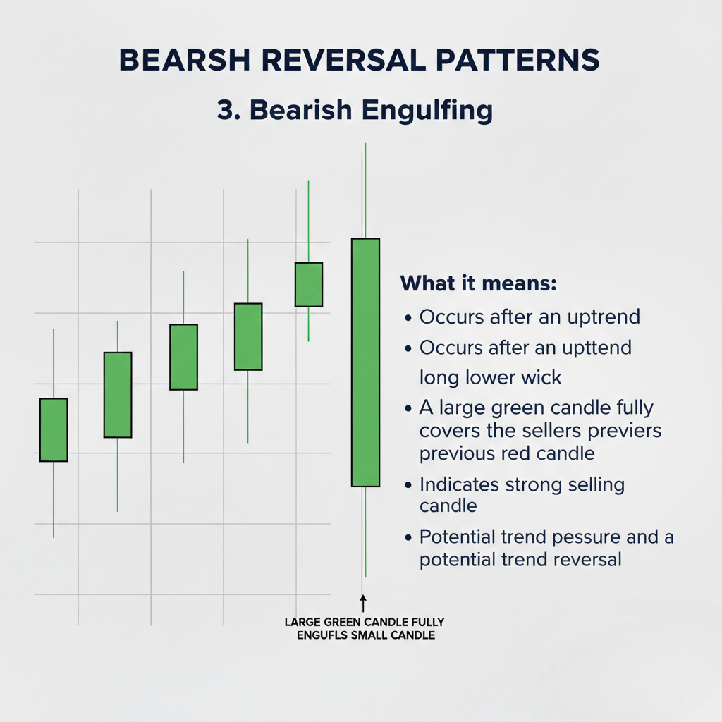 What it means: Occurs after an uptrend. The large red candle signifies that sellers have decisively taken control, overwhelming buying pressure and pushing the price down significantly. This is a strong indication of bearish pressure and a potential trend reversal.