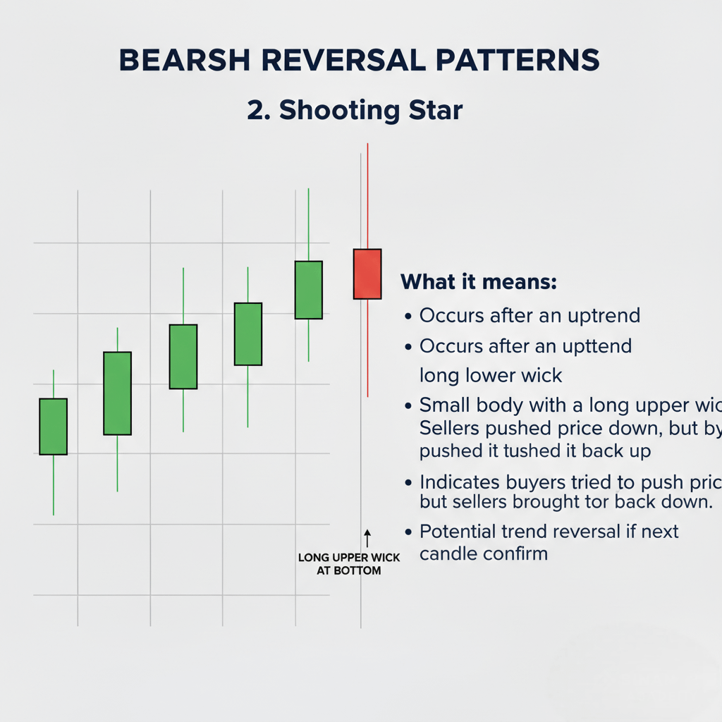 What it means: Occurs after an uptrend. The long upper wick indicates that buyers tried to push the price higher, but strong selling pressure brought it back down towards the open. This signals that bullish momentum is fading, and a potential bearish reversal could be imminent.