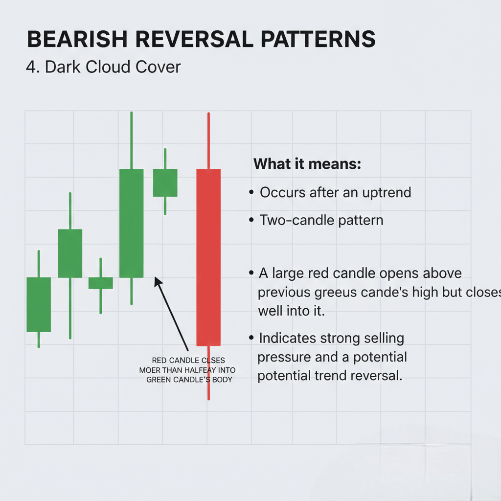 The Dark Cloud Cover is a two-candle bearish reversal pattern that signals the end of an uptrend. Think of it as a "storm" moving in to overshadow previous gains.