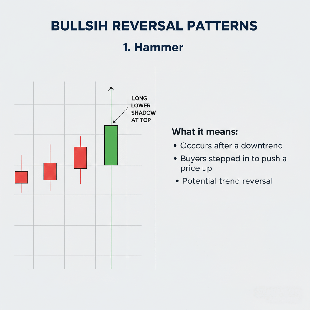 What it means: Occurs after a downtrend. The long lower wick indicates that sellers pushed prices down significantly, but buyers stepped in aggressively to push the price back up towards the open. This suggests a potential shift in momentum from sellers to buyers and a possible trend reversal.