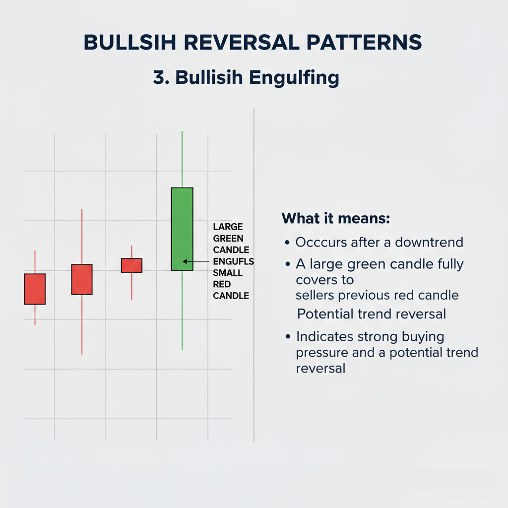 What it means: Occurs after a downtrend. This is a strong bullish reversal signal. The first red candle shows selling pressure, the small middle candle indicates indecision, and the final large green candle signals that buyers have taken control, potentially leading to a new uptrend.