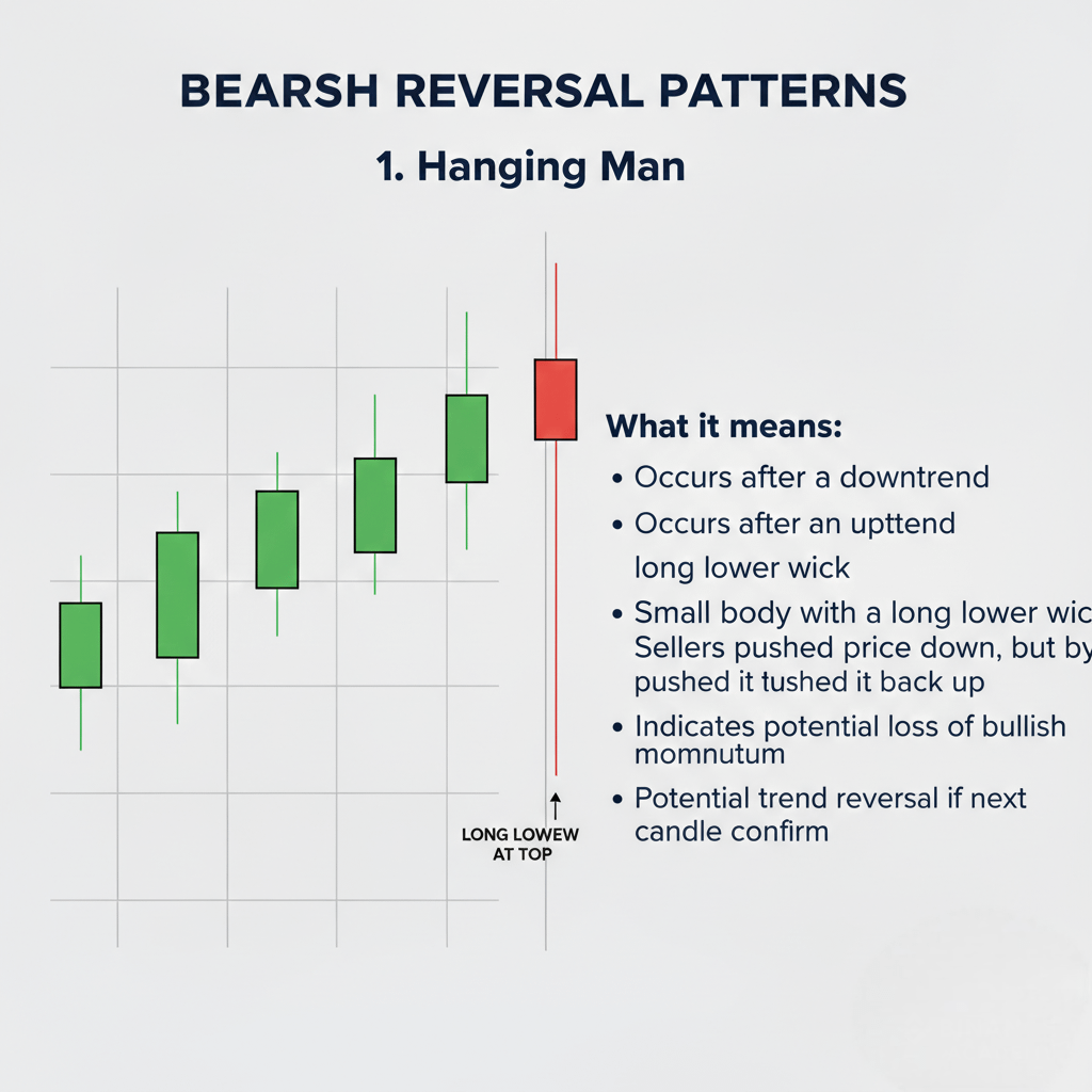 What it means: Occurs after an uptrend. The long lower wick signifies that sellers attempted to push the price down, even within a rising trend. While buyers pushed it back up, this pattern suggests a potential loss of bullish momentum and that selling pressure might be increasing. A bearish confirmation from the next candle is often sought.