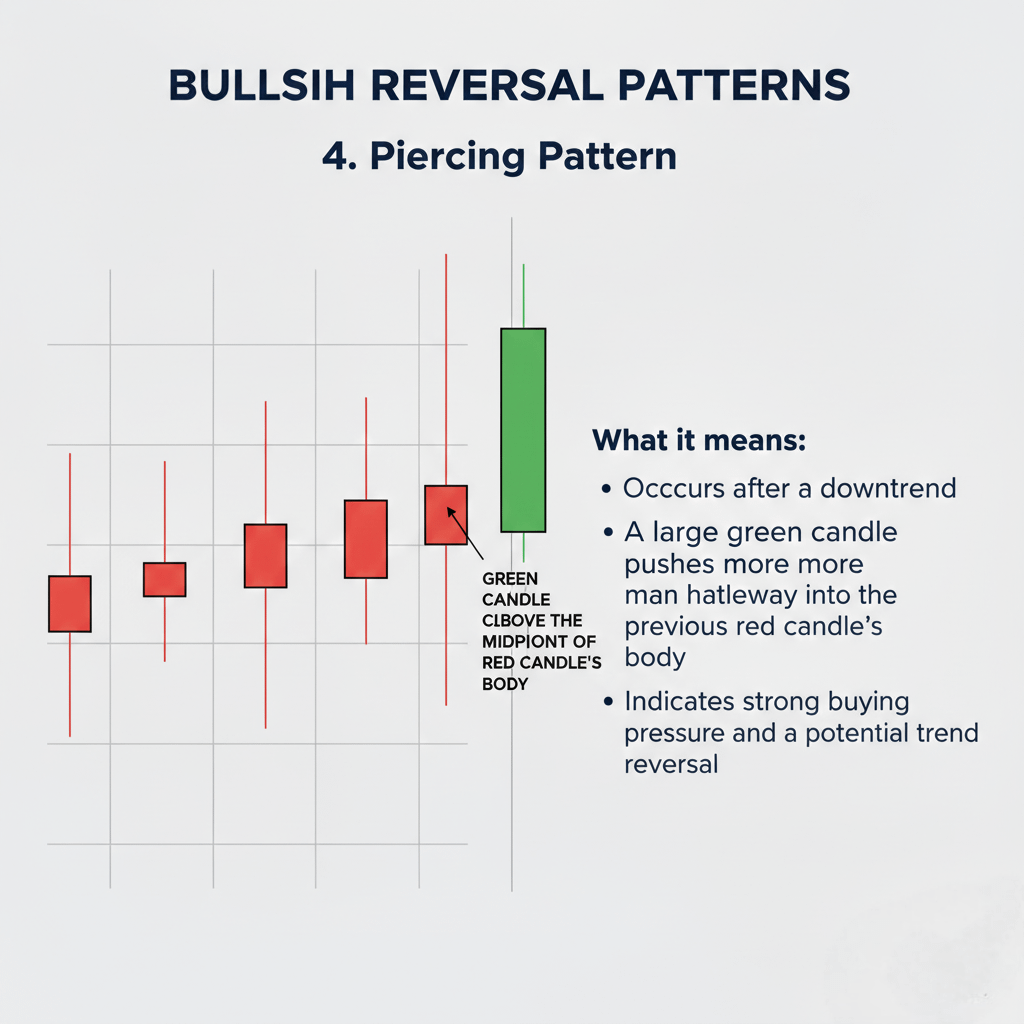 Appearance: After a red candle in a downtrend, a green candle opens below the previous red candle's close but then closes more than halfway into the body of the previous red candle.