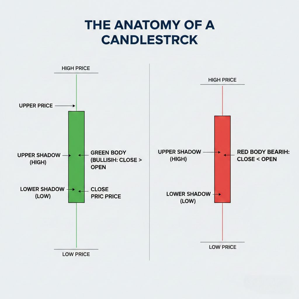 Body: The thick part of the candle, representing the range between the opening and closing price. A green (or white) body indicates the closing price was higher than the opening (bullish), while a red (or black) body signifies the closing price was lower than the opening (bearish).
