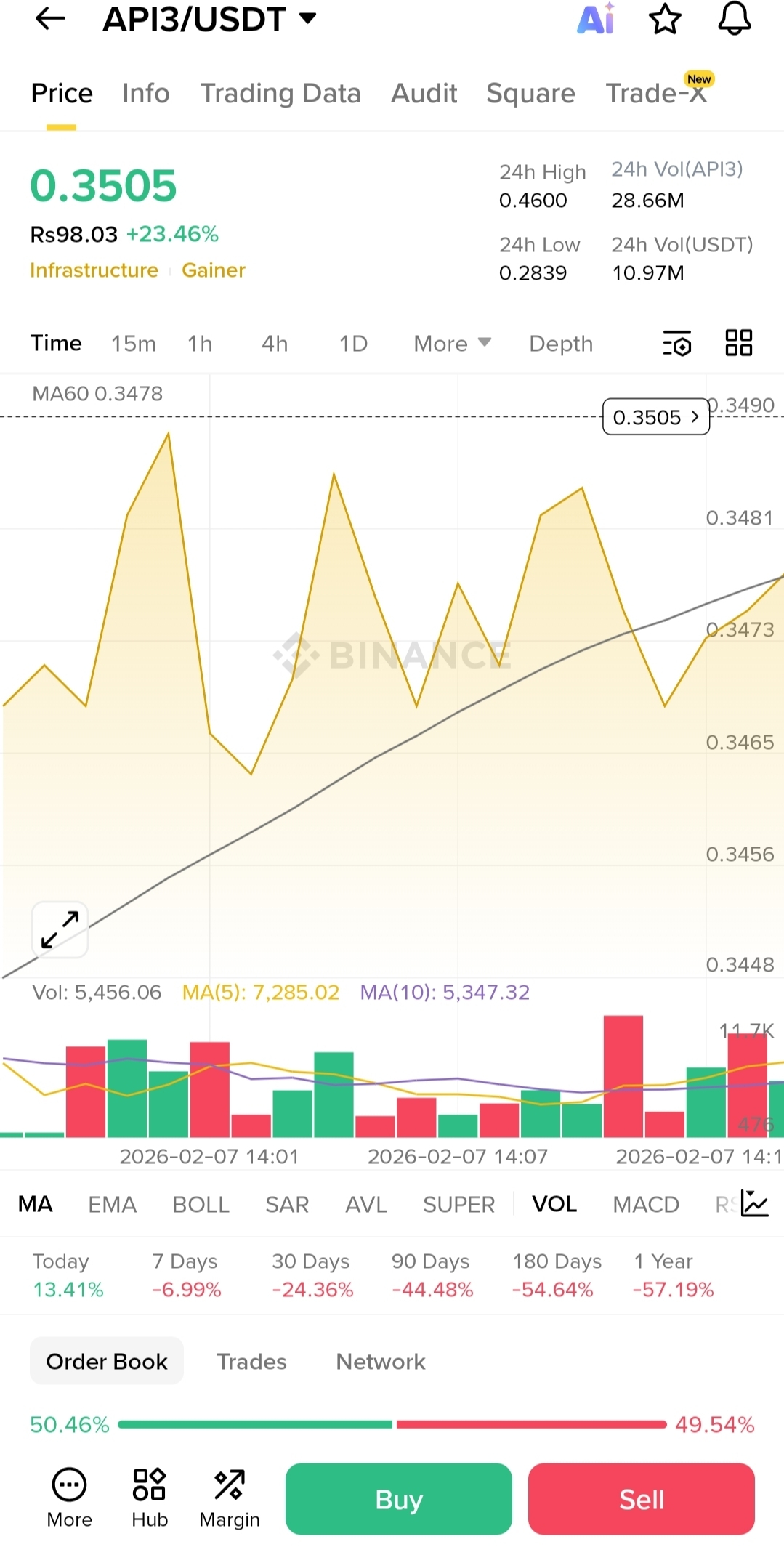After dipping near $0.28, buyers stepped in aggressively, pushing price back above the MA60 (~$0.3478). Holding above this moving average is important â it often acts as a trend pivot during early recovery phases.