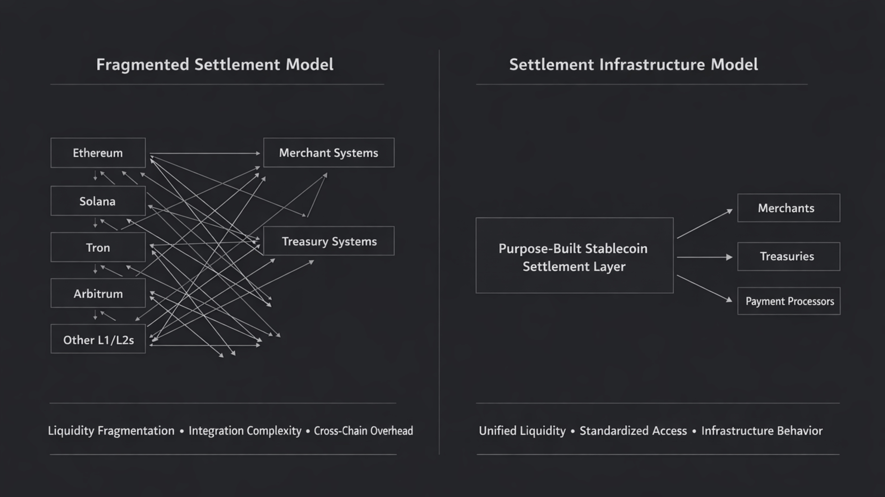 The more fragmented settlement gets, the less valuable any single chain becomes for actual settlement work. Merchants need to accept payments across different chains. Treasuries settle with counterparties on various platforms. Payment processors need infrastructure that doesn't fragment their addressable market.