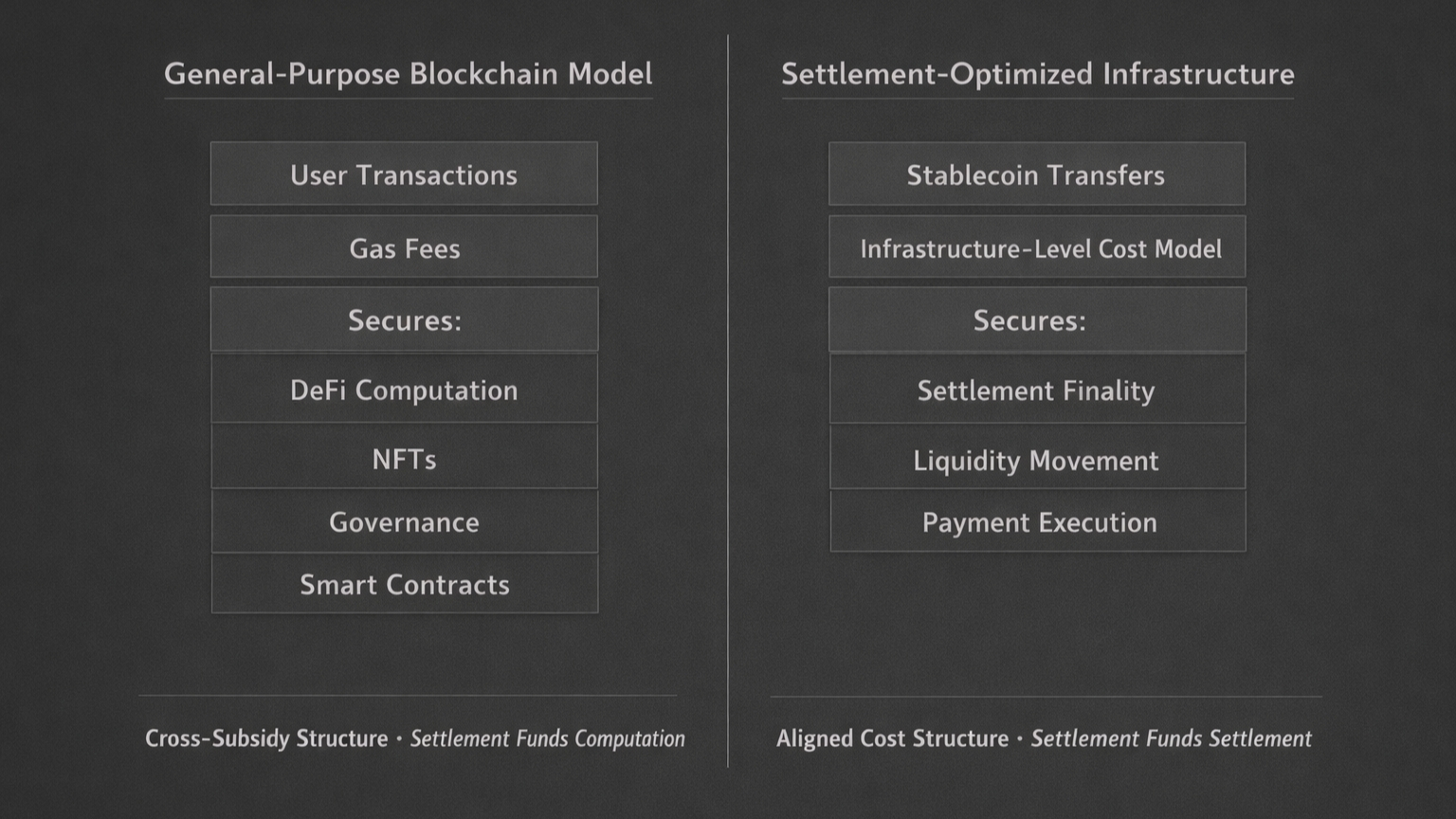 Economists call this a cross-subsidy problem. Simple settlement transactions subsidize complex operations. Cost spreads across everyone regardless of actual usage.